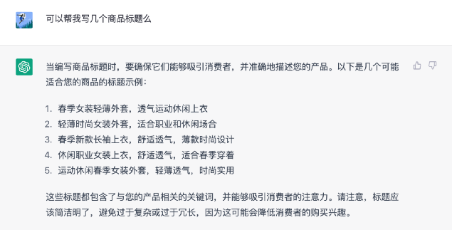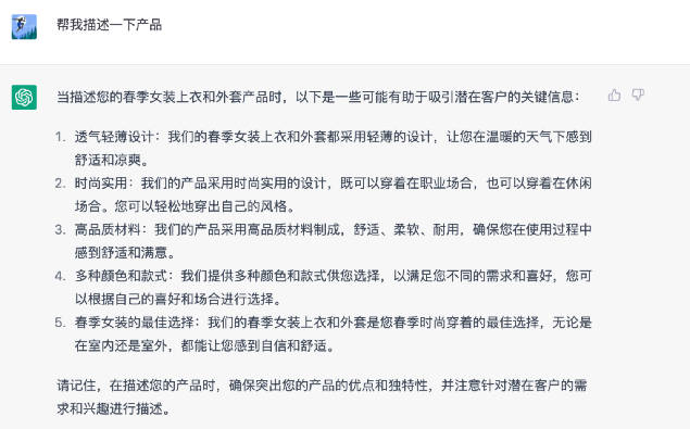 ChatGPT将生成一些关于商品页面的建议,包括标题、关键字、描述和图片等。你可以根据这些建议来调整你的商品页面。