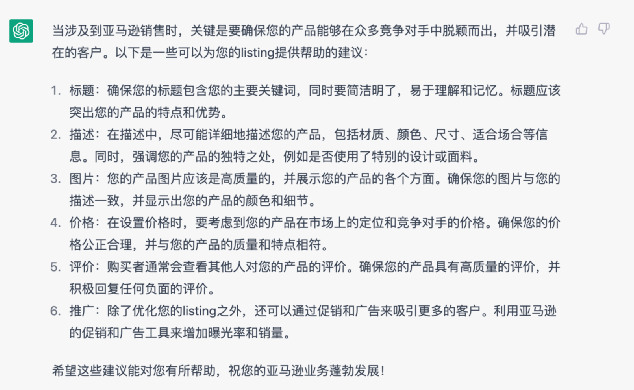总之,使用ChatGPT优化亚马逊Listing可以帮助你吸引更多的潜在买家,并提高你的销售额。