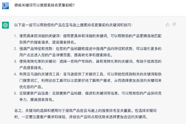 当我们问到“哪些关键词可以使搜索排名更靠前”时,ChatGPT给出的答案更多的是“渔”而不是“鱼”,即更多的会告诉我们,“产品排名靠前”的方法,而不是直接告诉我们哪些“关键词”会使排名更靠前。