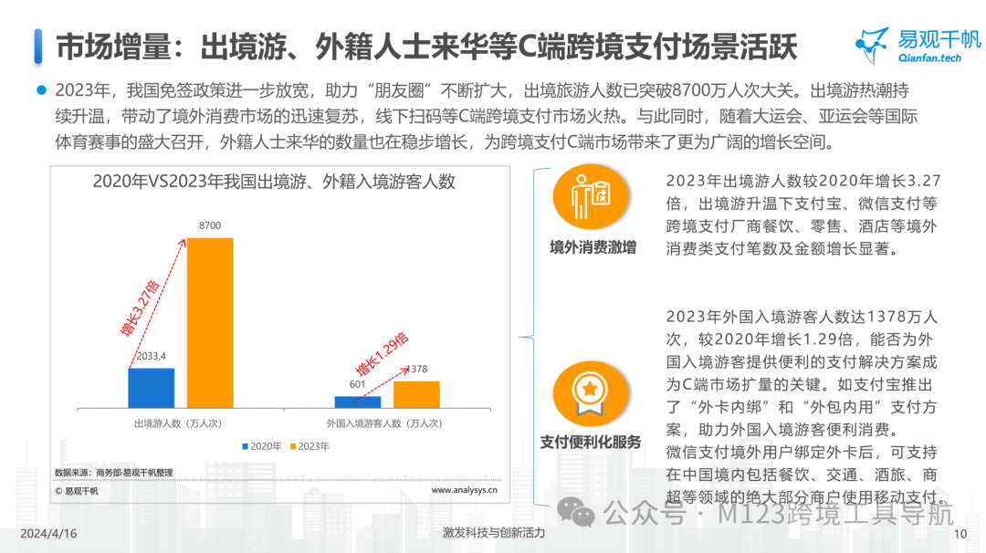 2023年,我国免签政策进一步放宽,助力“朋友圈”不断扩大,出境旅游人数已突破8700万人次大关。出境游热潮持续升温,带动了境外消费市场的迅速复苏,线下扫码等C端跨境支付市场火热。与此同时,随着大运会、亚运会等国际体育赛事的盛大召开,外籍人士来华的数量也在稳步增长,为跨境支付C端市场带来了更为广阔的增长空间。