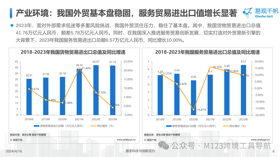 2023年,面对外部需求低迷等多重风险挑战,我国外贸顶住压力,稳住了基本盘。其中,我国货物贸易进出口总值41.76万亿元人民币,顺差5.78万亿元人民币。同时,在我国深入推进服务贸易创新发展,切实打造对外贸易新引擎的大背景下,2023年我国服务贸易进出口总额6.57万亿元人民币,同比增长10.00%。
