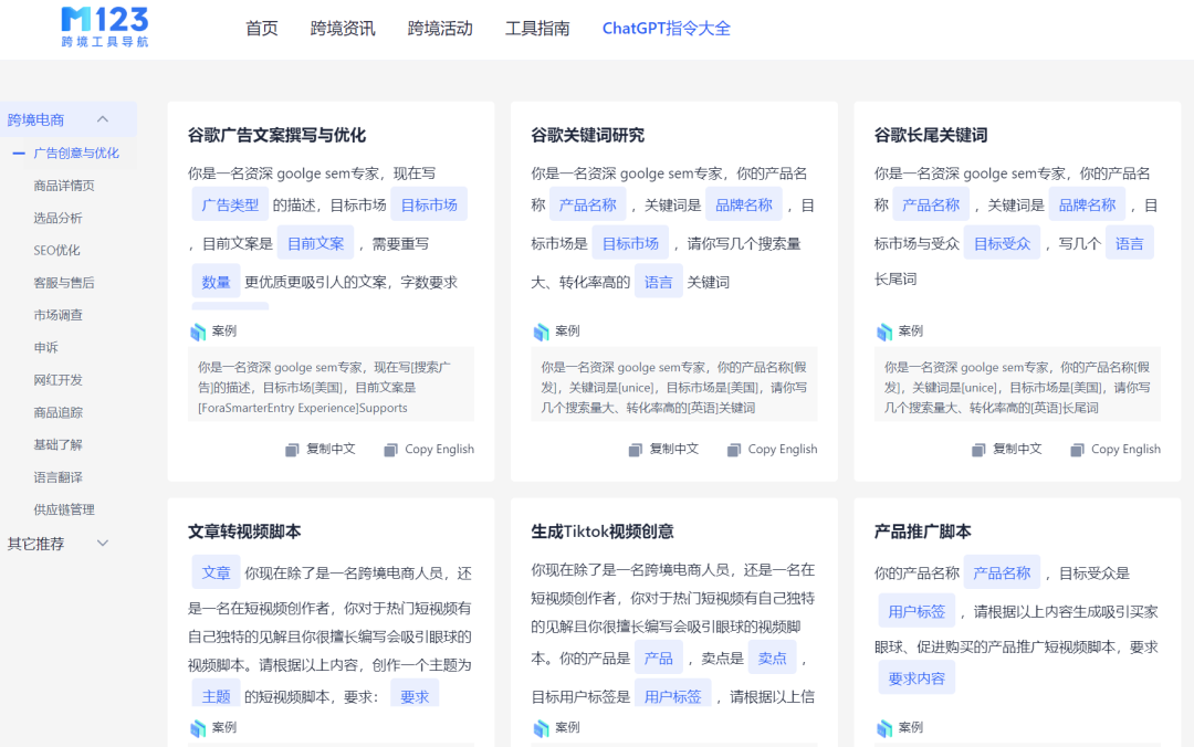 除了上述指令,还有客服售后、市场调研、账户申诉等其他指令。你可以访问M123跨境工具导航,查找ChatGPT指令大全以获得更多详细指令。