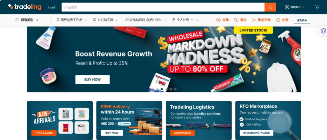免费推流:Tradeling⿎励中国供应商积极⼊入驻,并免费为中国供应商做宣传,相较于中东其他平台对中国卖家的封闭,可谓是诚意满满。