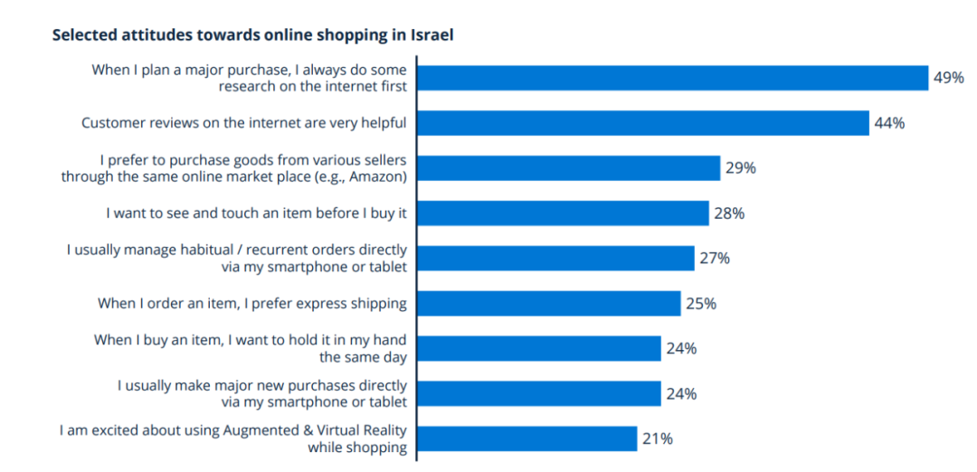 65%的以色列消费者在下单前会搜索并研究想要购买的物品;54%的人认为网上顾客的评论对其选择商品很有帮助;29%的人偏好在同一电商平台购买商品;25%的人喜欢快递配送物品。