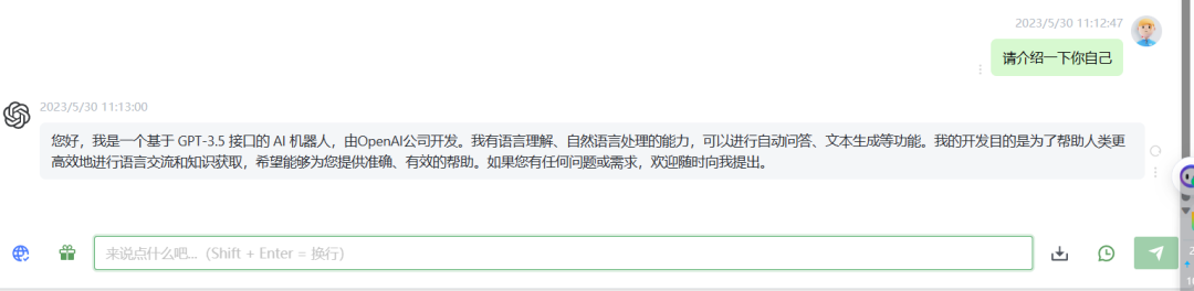 其实就可以把AIchatOS当做ChatGPT来用,毕竟如果向chatAIos提问,“介绍一下你自己”,它会给出一个这样的答案。