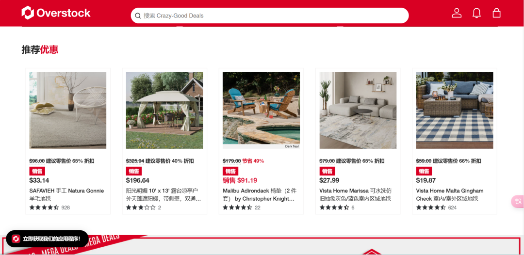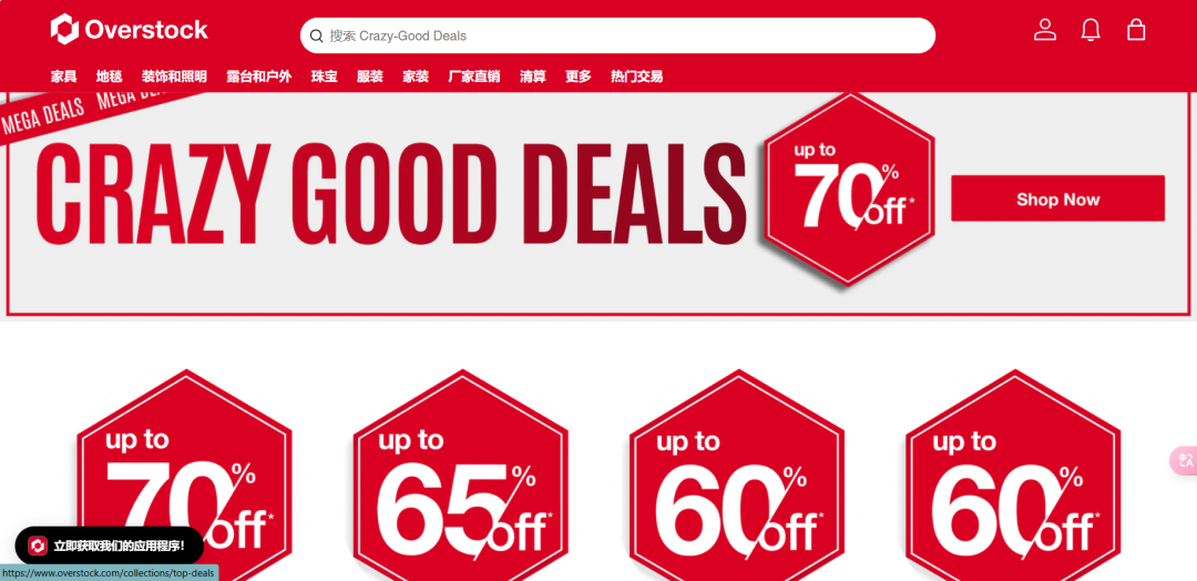 作为美国知名的网上购物平台,Overstock提供家具、家居用品、床上用品、珠宝手表、3C数码、健康美容、户外运动和服装鞋帽等多种商品类别 。