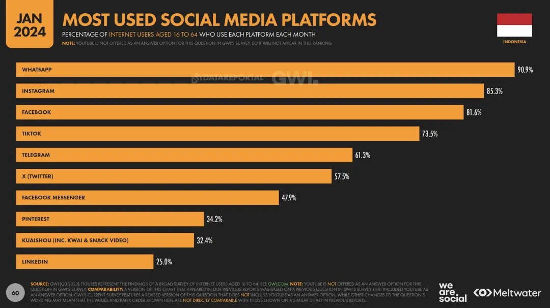 Instagram:Instagram是印尼使用率第二高的社交媒体平台,在印尼拥有1.009亿用户,其中女性用户占比较高。Instagram强调视觉效果,为品牌提供了通过精美图片和视频提高品牌认识度的机会。
