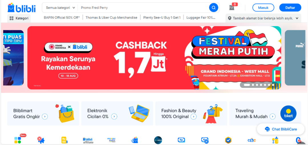 Blibli是一家成立于印尼本土的电商企业,在印尼拥有4000万月活用户,网站月访问量达8000万次,目前已成为印尼五大电商平台之一。Blibli涵盖日常必需品、旅游出行、生活方式、电子产品、家具用品乃至水电费缴费等方面,并且拥有完善的物流和仓储体系。