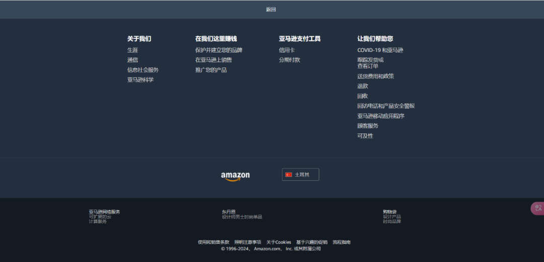 4.登录亚马逊土耳其站点主页,点击网页最下方“在亚马逊上销售”,申请开立账户。