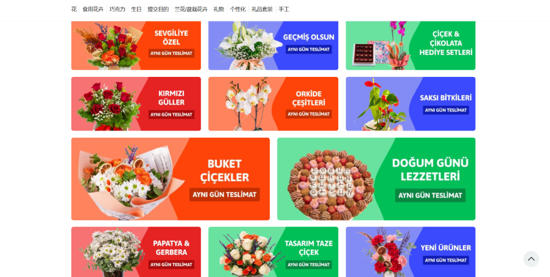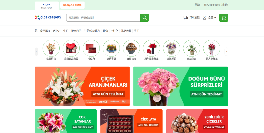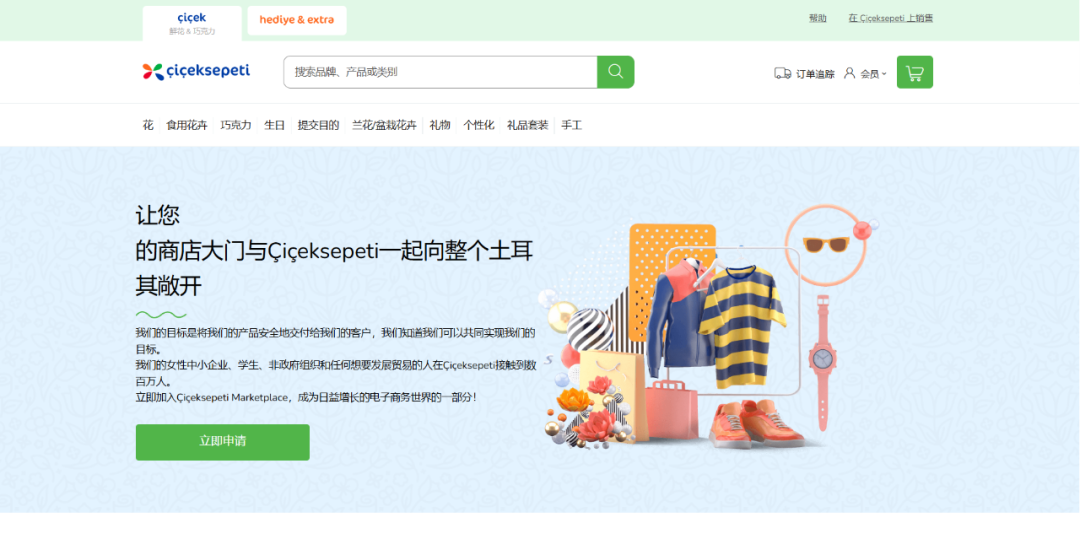 作为土耳其鲜花和礼品领域点击量最大的电子商务网站,不仅可以销售鲜花这一类别产品,在网站上还可以选择在其他您想要的类别中销售。Çiçeksepeti利用客户潜力在所有类别中推广销售卖家产品,销售类别覆盖家具与生活、宠物、化妆品、珠宝首饰、食用花卉、时尚、母婴、户外运动、办公等。