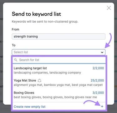 接下来,从下拉框中选择要添加关键词的关键司列表,或者点击Create new empty list来创建新列表。