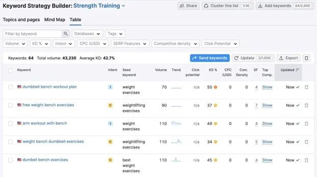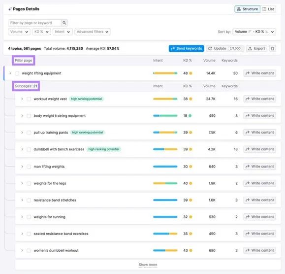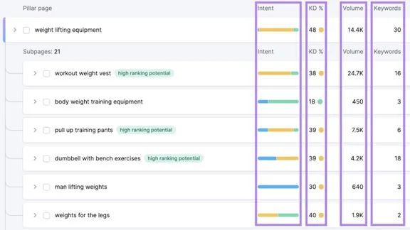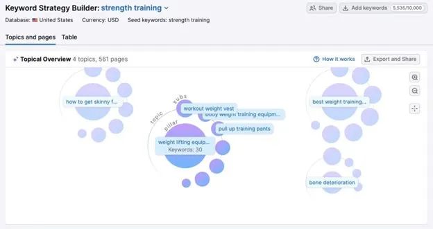 我们可以为网站创建多个支柱页面,而每个支柱页面都会有多个子主题。推荐使用Semrush的Keyword Strategy Builder来组织所有内容。
