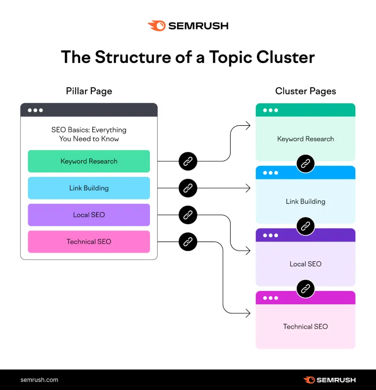 例如,假设您想创建一个关于SEO的子主题集群(Cluster page)。您的支柱页面可能是一篇涵盖SEO基础知识的详细文章,而在其他子主题中,可能会提及Technical SEO、外链建设和本地SEO。