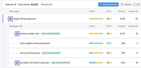 然后,通过点击每个主题旁边的复选框,来选择要包含在内容计划中的特定支柱页面和子主题。