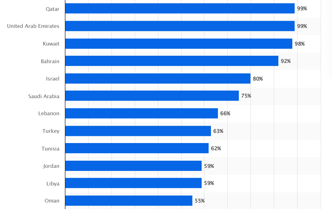 图:中东和北非国家活跃的社交媒体渗透率,Statista