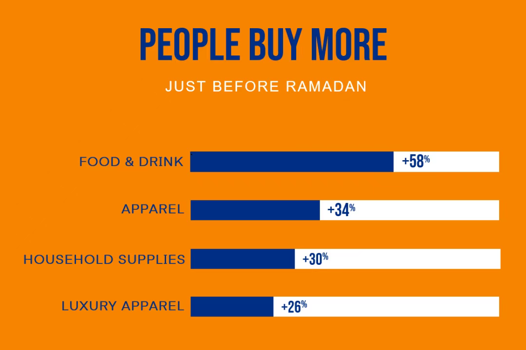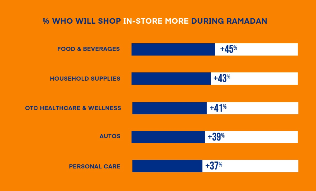 超半数的沙特人会在宗教节日开始前几周进行购物,76%的沙特人表示将在斋月期间增加消费。他们在斋月前主要增加食品饮料(58%)、服装(34%)、家居用品(30%)、奢侈品服装(26%)等方面的消费。