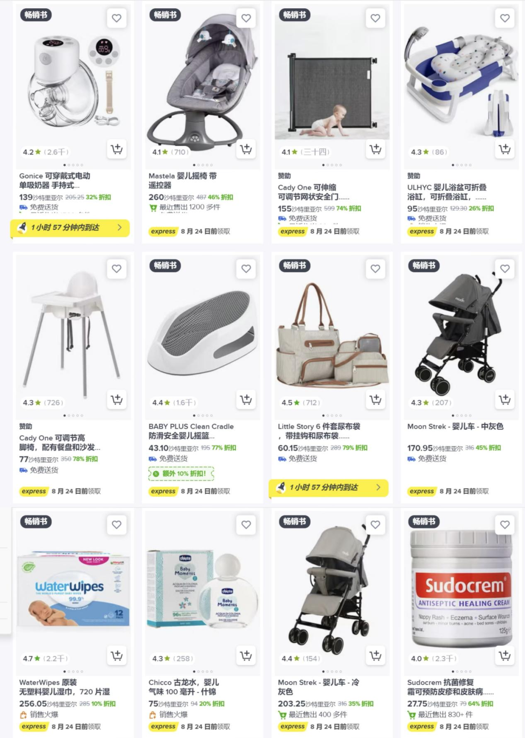 得益于年轻家庭和新生人口增长,母婴用品在沙特电商市场的需求日益提升。沙特人对母婴用品的环保、高品质、舒适和时尚的需求不断增长。其中折叠式婴儿车、多功能妈咪包(尿布垫)、手持吸奶器、爬行垫、婴幼儿护理用品的销量十分火爆。