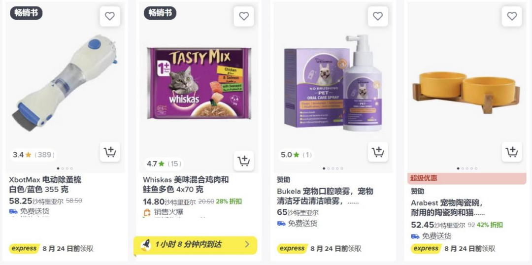 沙特人对宠物的陪伴需求增加,沙特消费者对宠物用品的需求不仅体现在日常必需品上,还体现在对高品质、智能化产品的追求上。充电式剃毛器、自动饮水机、电动除虱梳、多层猫爬架、营养饲料等都是热销榜前几名商品。