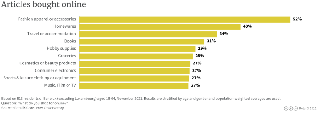 就品类而言,比荷卢这三个国家的消费者,线上购买时尚产品的相关支出最多。卢森堡线上人均消费约为1344欧元,荷兰线上人均消费约为963欧元,比利时线上人均消费约为540欧元。在比荷卢经济联盟区域市场占据主要市场地位,并跻身TOP 100的时尚零售商有C&A、Bonprix、Zalando、de Bijenkorf、Zara、H&M、NA-KD、Asos和SHEIN等。