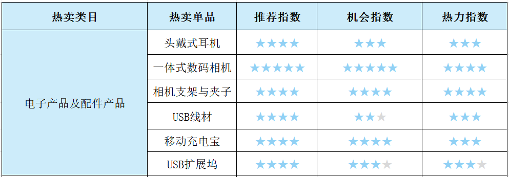 热度Top:头戴式耳机、相机支架、键盘套装、移动充电宝、游戏手柄