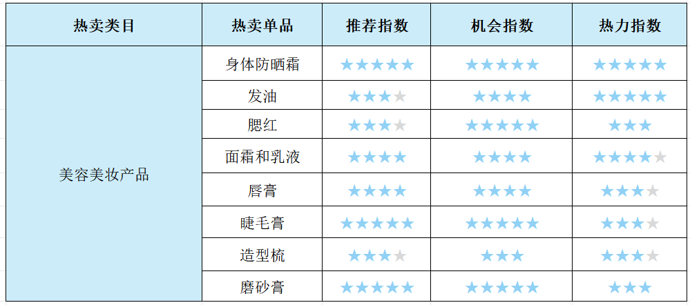 热度Top:护发精油、浓密睫毛膏、发型梳、身体防晒霜