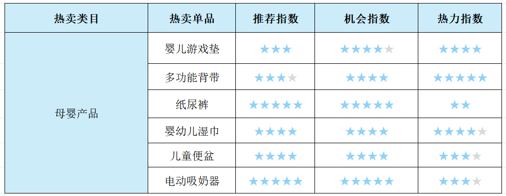 热度Top:纸尿裤、折叠手推车、湿巾、爬行垫