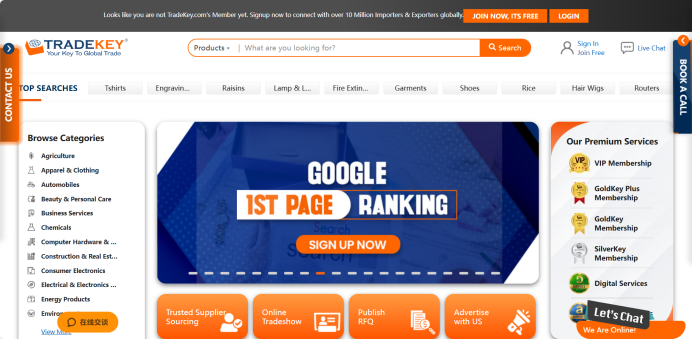 TradeKey是一个全球知名的B2B平台,致力于为全球买家和卖家提供一个高效、安全的交易环境。平台拥有来自全球240个国家、超过900万的注册用户,产品涵盖机械设备、电子产品、化工品、纺织品和建筑材料等多个行业类别。页面浏览量高达3.4亿,在全球范围内拥有较高的曝光率。