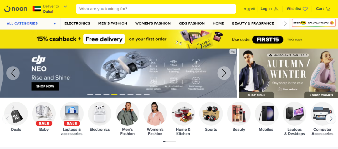 Noon是中东地区第二大电商平台,凭借其强大的市场定位、丰富的产品种类、高效的物流服务和深入的市场洞察能力,在中东电商市场中取得了显著的成绩,被称为“阿拉伯地区首个电子商务平台”。作为中东本土化的电商平台,Noon目前已经覆盖阿联酋、沙特、埃及三个国家,并计划在未来几年内覆盖整个中东北非市场,其中在沙特地区的市场表现力最佳。