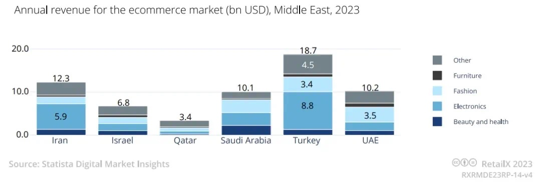 目前,中东电商市场正处于总量较低但增速暴涨的强势发展阶段。作为中东电商市场领头羊的沙特和阿联酋,其市场规模仅为100亿美元左右,参考2018年至2022年保持着32%的复合增长率,中东电商市场在未来仍有很大的增长空间。