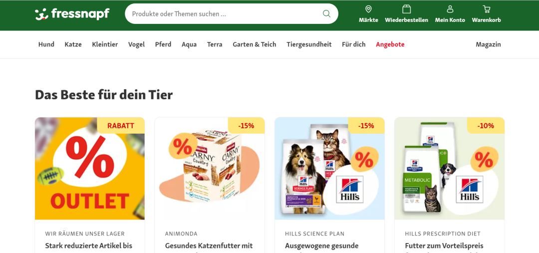 Fressnapf创立于德国, 目前已成为欧洲最大的宠物用品零售商之一。Fressnap业务覆盖了奥地利、瑞士等十二个欧洲国家,在欧洲拥有超过1000家线下门店,截至2022年,销售额已突破35亿欧元,进一步巩固了其在欧洲宠物用品市场的领先地位。除了实体店外,Fressnapf 的电子商务网站Fressnapf.de还为用户提供送货上门服务。平台提供丰富的宠物产品,包括宠物食品、玩具、宠物床、笼子、服装、护理用品等,覆盖狗、猫、鱼、鸟、仓鼠等小型哺乳动物的需求。