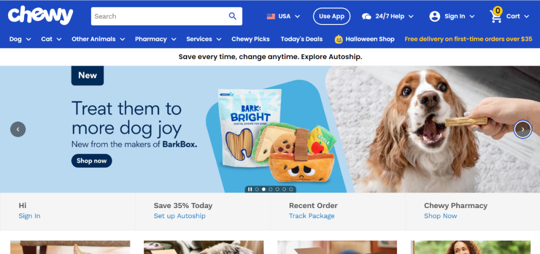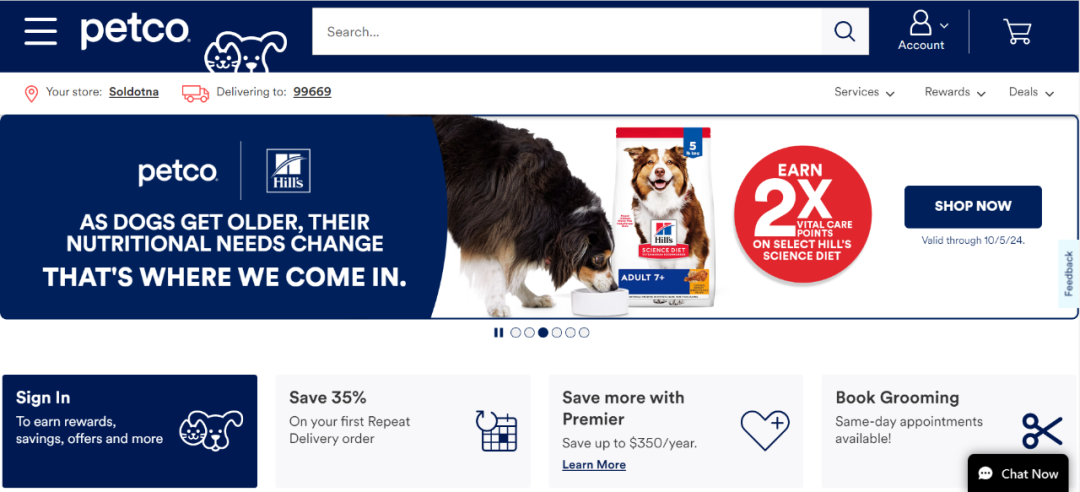Petco是美国领先的宠物用品和食品零售商,在美国、墨西哥和波多黎各拥有超过1500家宠物专营店,庞大的线下网络为线上电商平台Petco.com提供了强大的支持和互补。平台产品覆盖宠物食品、宠物服饰、宠物美容用品、宠物牵引绳和宠物耐用品等多个品类,满足了宠物主人多样化的需求。Petco不仅销售宠物用品,还提供宠物美容、兽医、宠物收养和小宠物交易等服务,形成了完整的宠物服务生态链。