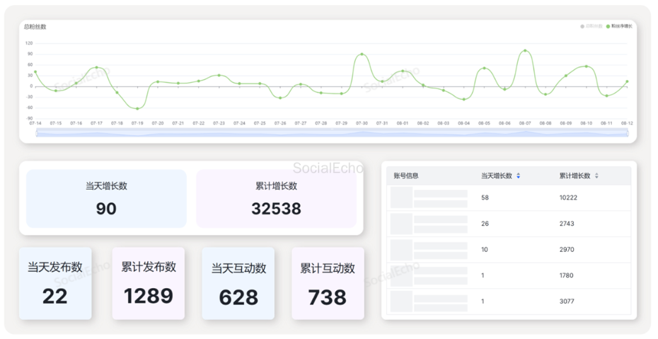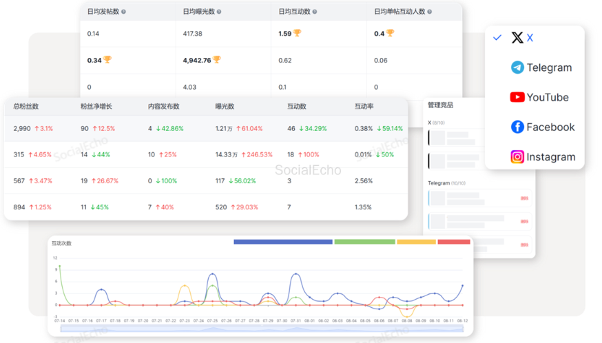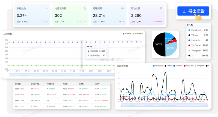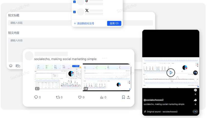 用户可以在SocialEcho上管理内容日程、发布内容、与评论区互动、进行账号分析、社媒舆情监控以及竞品追踪等,无需多个平台多个账号来回切换,一个SocialEcho搞定你的社媒运营。