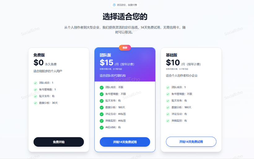 您可以享受1个频道的永久免费,如果您需要集中管理多个频道和更强大的功能,推荐订阅socialecho套餐