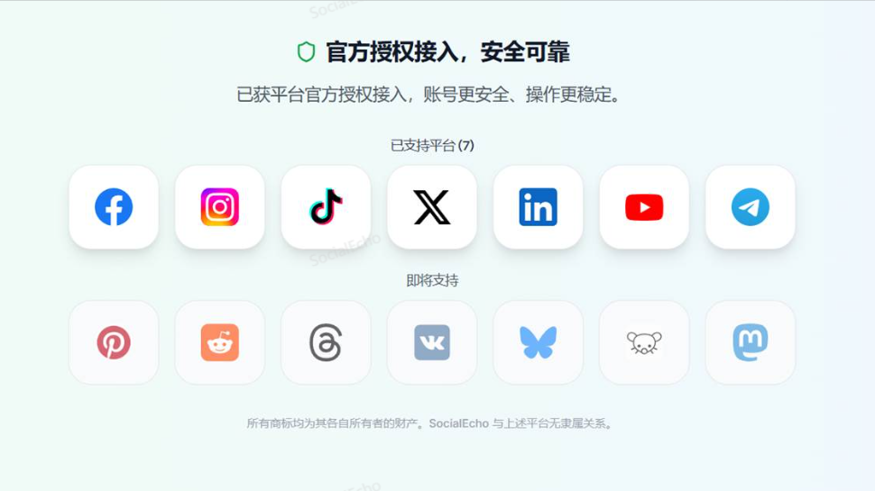 socialecho是一款AI驱动的海外社媒多账号管理平台,目前已支持7大主流平台:FaceBook、Instagram、X(Twitter)、TikTok、YouTube、Telegram、LinkedIn,对接官方API接口。