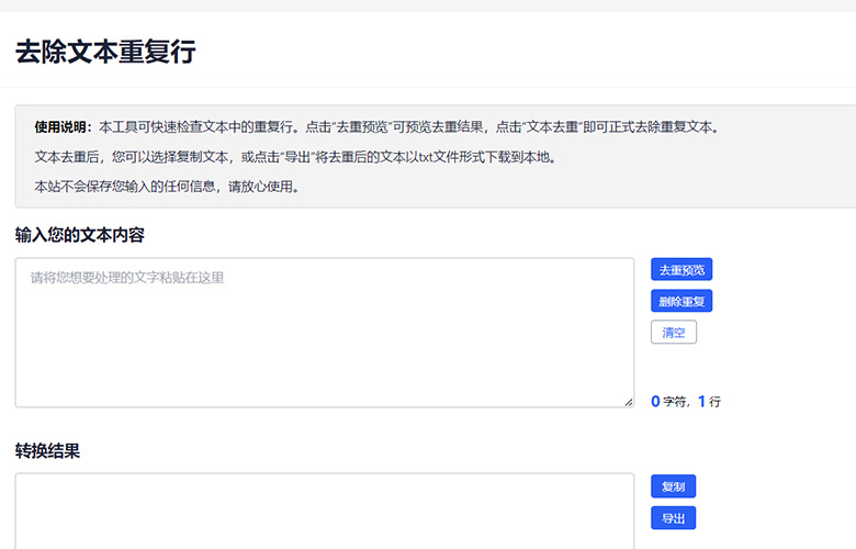文本去除重复行工具可以删除完全相同的行,还可以可以用于文本去重、数组去重、关键词去重等多种情况。