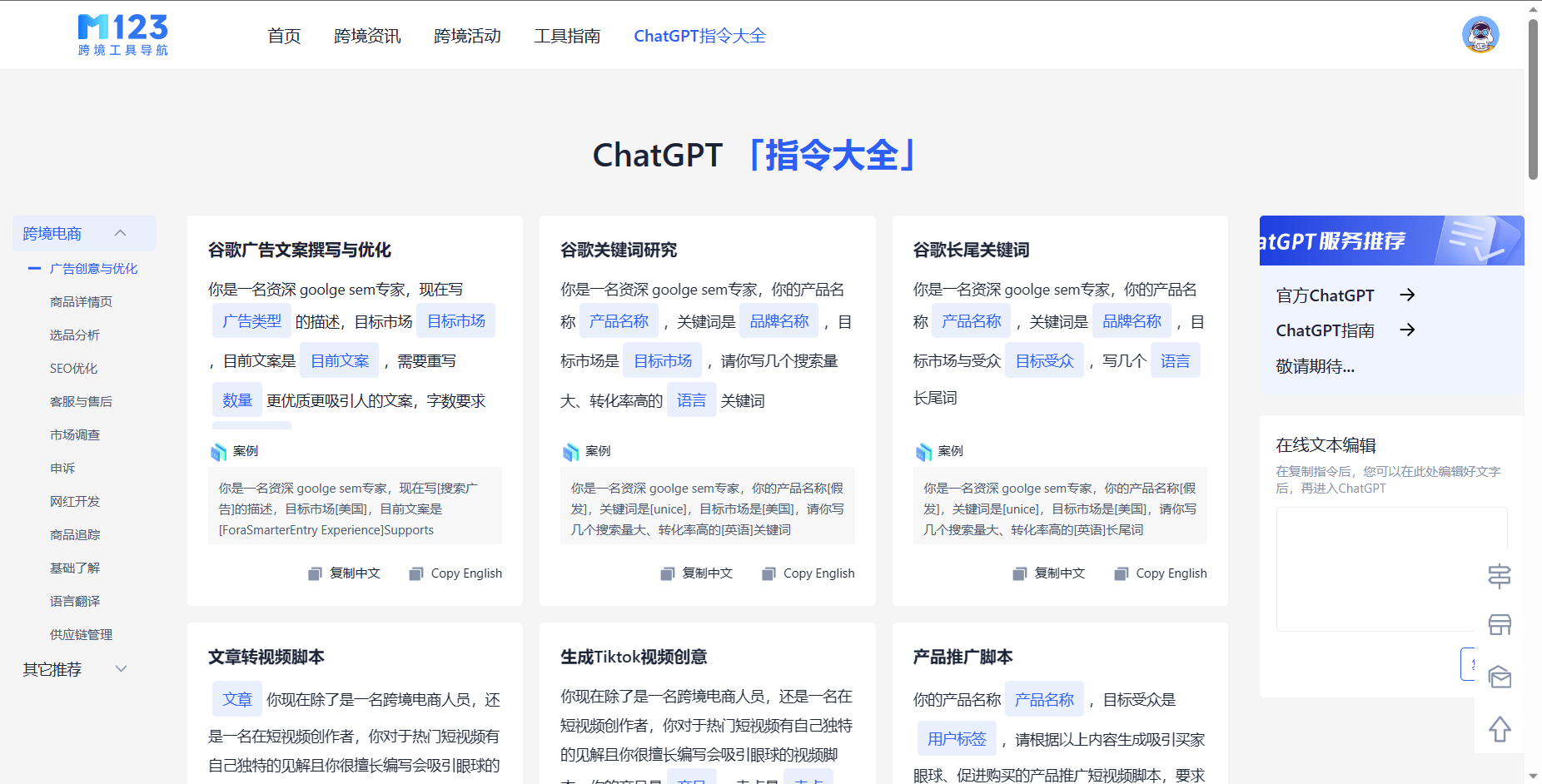 M123跨境电商ChatGPT提示词大全,包含了广告创意与优化,商品详情,选品分析等。用户可以根据自己的需要选自提示词。
