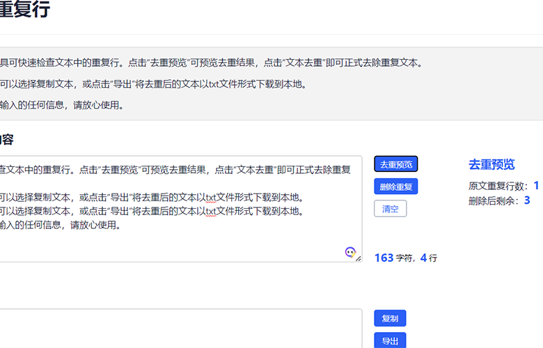 该功能是文本去重工具的核心功能。在对文本数据进行预览之后,我们可以一键删除其中的重复行信息,以达到清除冗余数据的目的。