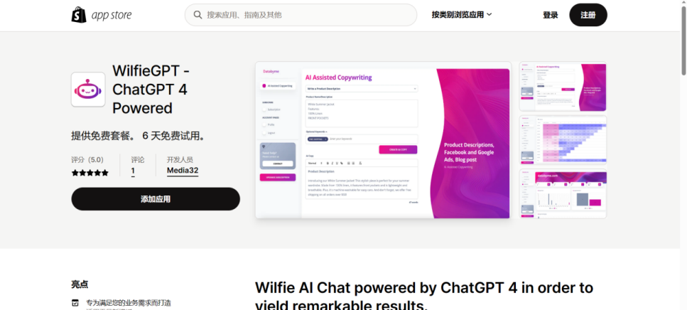 shopify.com/databyme?locale=zh-CN">WilfieGPT(点击使用工具)是一款基于人工智能技术的自然语言处理工具,可以帮助用户快速生成高质量的文本内容。它的基础功能包括文本生成、文本摘要、情感分析、实体识别等,可以广泛应用于各种工作场景中。