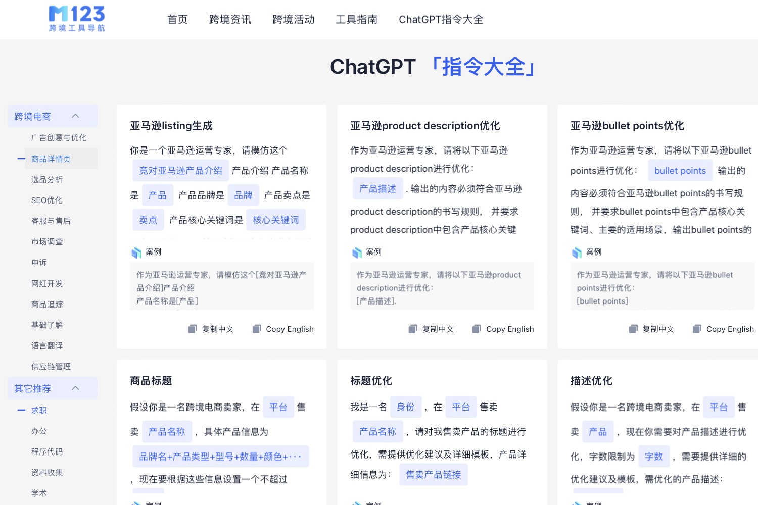 利用ChatGPT管理亚马逊商品页面,可以提高管理效率、优化内容质量并提升销售表现。无论是编写/优化商品描述、撰写KOL开发信、写博客/帖子、邀请评价信、客户邮件回复还是警告跟卖者,ChatGPT都是一个强大的工具,可以帮助你在各个方面取得更好的管理效果。通过与ChatGPT的互动,您可以探索更多指令和应用,进一步提升亚马逊销售能力。具体操作方案为进入M123网站后,点击顶部ChatGPT指令大全,并在左侧栏目中找到需要的指令,复制到ChatGPT对话框内。