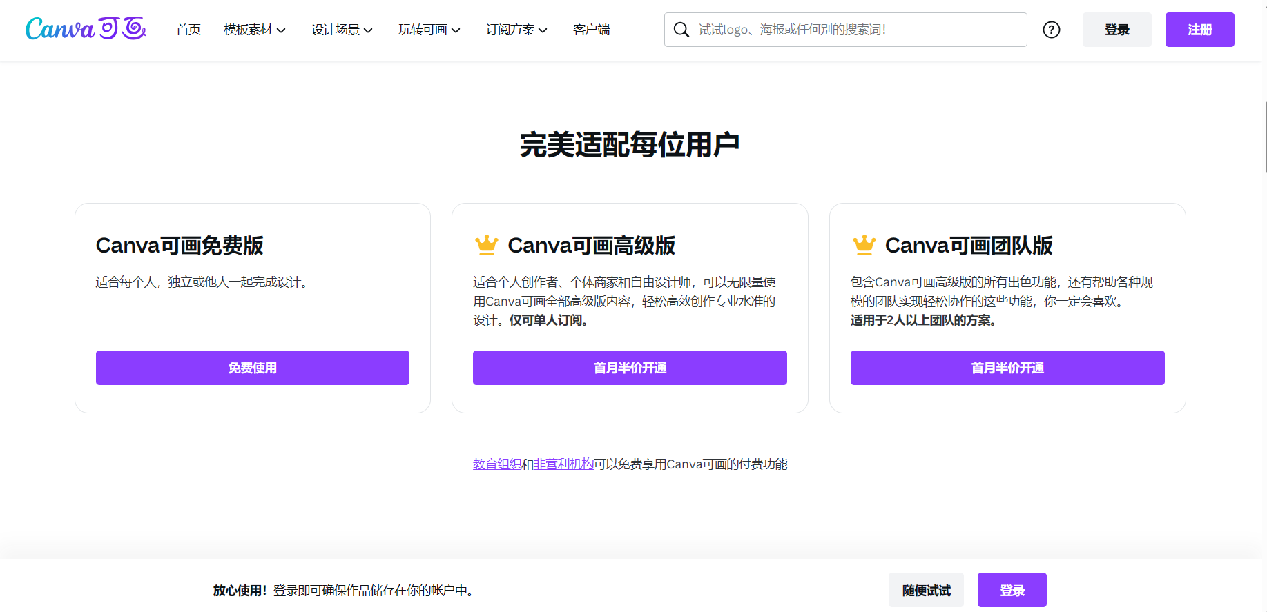 Canva(点击使用工具)是一款图形设计工具,它的应用领域不仅局限于国内,而且在跨境领域也有着广泛的应用。Canva(点击查看详情页)是一款在线网站,全球用户都可以使用。Canva的付费模式包括个人版、团队版和企业版,价格分别为每月12.95美元、每月30美元和每月30美元(需联系销售)。Canva需要注册账号才能使用,部分高级功能需要付费解锁。操作流程为注册账号->选择设计类型->选择模板或自定义设计->编辑设计->导出保存。
