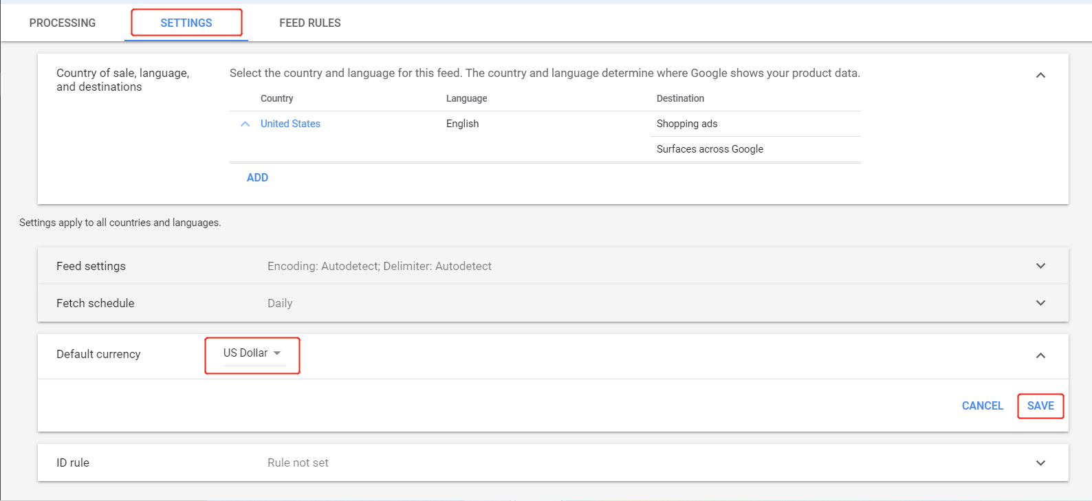 第7步,依次点击feed-settings-default currency(选择货币)-processing-fetch now,即feed上传完毕。