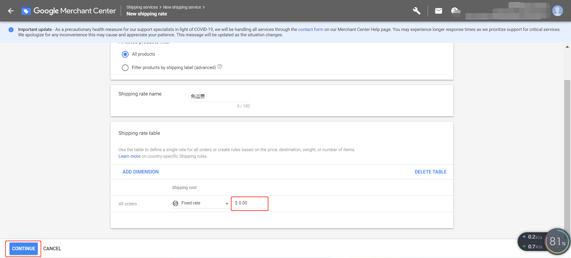 新增运费表,点击➕,输入运费名称,创建运费表格,输入费率,点击继续,点击保存。