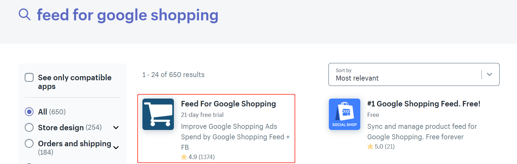 进入shopify后台,依次点击APPS-APP STORE -搜索feed for google shopping