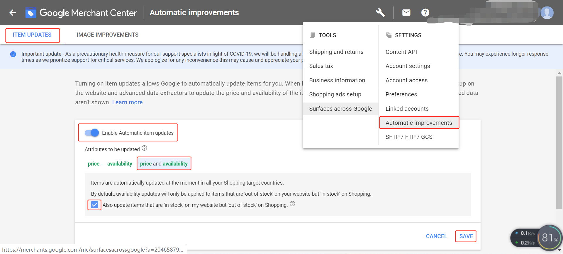 依次点击自动改进-启用商品自动更新功能-选择价格和库存状况-勾选自动更新功能-点击保存;