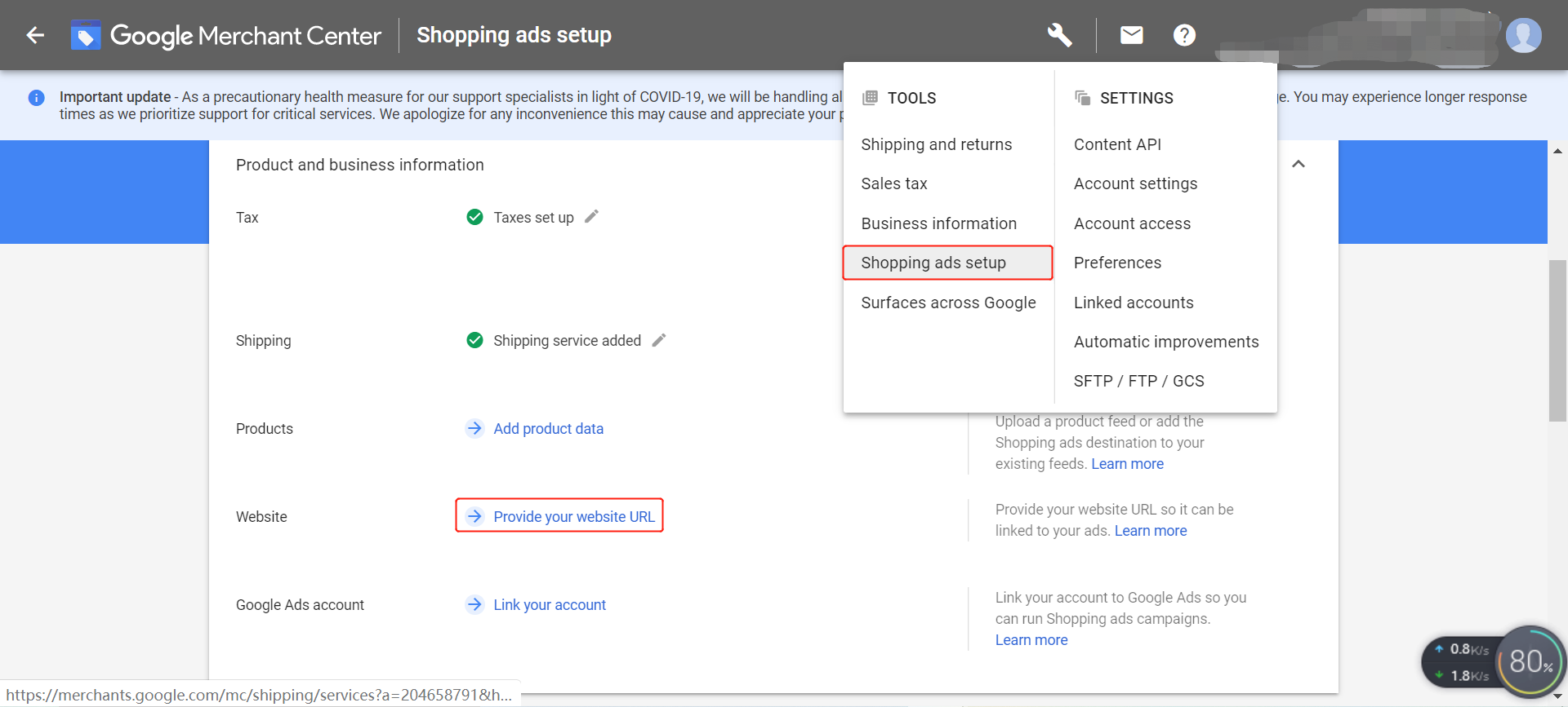 第1步,依次点击购物广告设置-提供您的网址-保存/