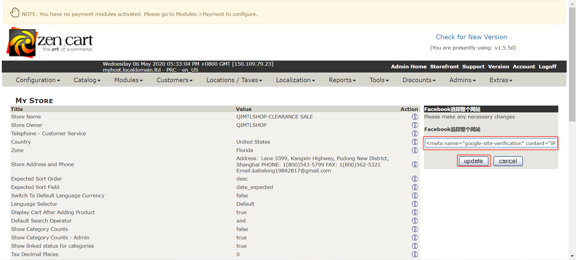 第3步,进入zencart网站后台,依次点击configuration-my store-facebook追踪整个网站,黏贴刚刚复制的代码