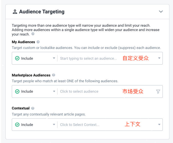 注意:如果同时选择My audiences,Marketplace Audience,Contextual三种受众类型会定位三者交集部分,缩小受众范围。