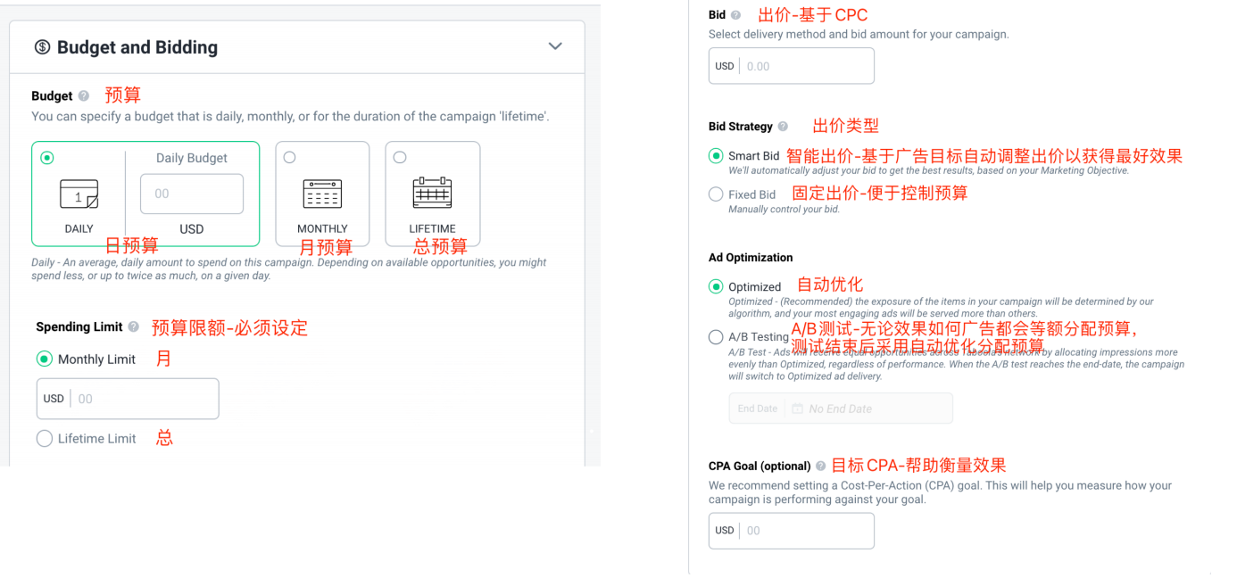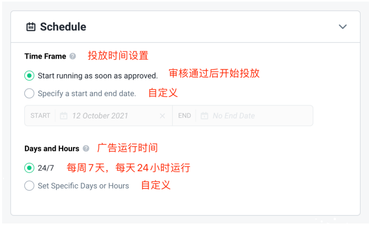 Time Frame栏可对广告投放时间进行设置,START&END不更改的情况下,广告审核通过后会立刻上线并开始产生花费;