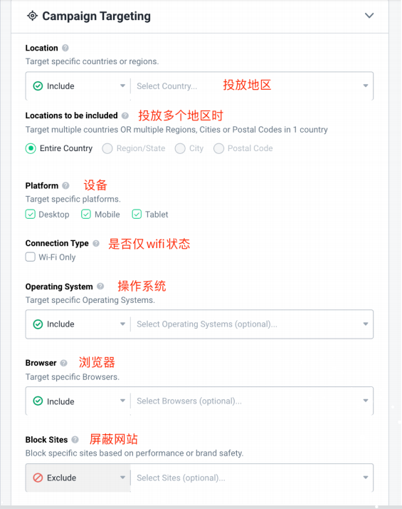 Location中可下拉选择想要投放(include)或排除(exclude)的国家;