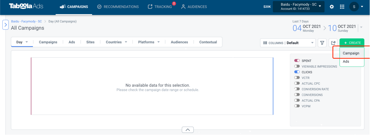 进入CAMPAIGNS板块,点击右侧绿色CREATE,选择Campaign;